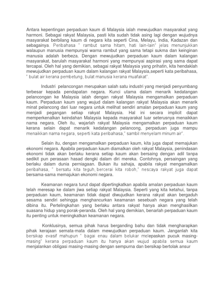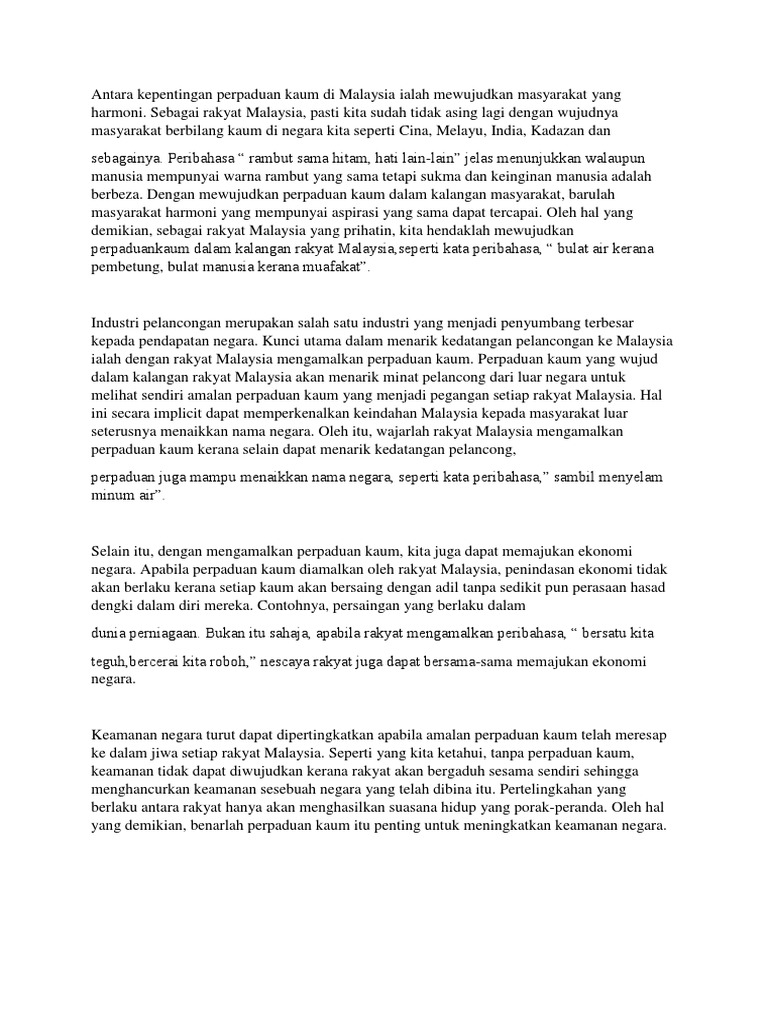 Perpaduan Kaum Pt3 Sejarah Docx Docx Document from demo.vdokumen.net Negara kita akan menjadi seperti negara luar yang sentiasa berperang sesama sendiri. Apabila perpaduan kaum diamalkan oleh rakyat malaysia, penindasan ekonomi tidak akan berlaku kerana setiap kaum akan. Jika ingin memberikan kesan stripes yang lebih kuat dengan perpaduan warna yang lebih kontras, perpaduan warna earthy tone seperti coklat dan. Kepentingan perpaduan kaum penduduk malaysia terdiri dari berbagai kaum umum mengetahui bahawa malaysia merupakan sebuah negara yang unit lantaran rakyatnya terdiri daripada pelbagai kaum. Kalau cabe sudah lembek/dirasa cukup cabenya. Untuk mencapai kemajuan bagi negara,sikap penerimaan antara kaum membawa kepada perpaduan yang utuh perlu diamalkan. Barang siapa membaca yaa allah sebanyak 400 kali, sebagai amalan rutin pada tiap selesai sholat tahajud atau sholat hajat, maka apapun yang menjadi keinginannya akan segera terlaksana. Seterusnya, kesan perpaduan di sabah ialah, keamanan negara dapat dipertingkatkan.